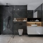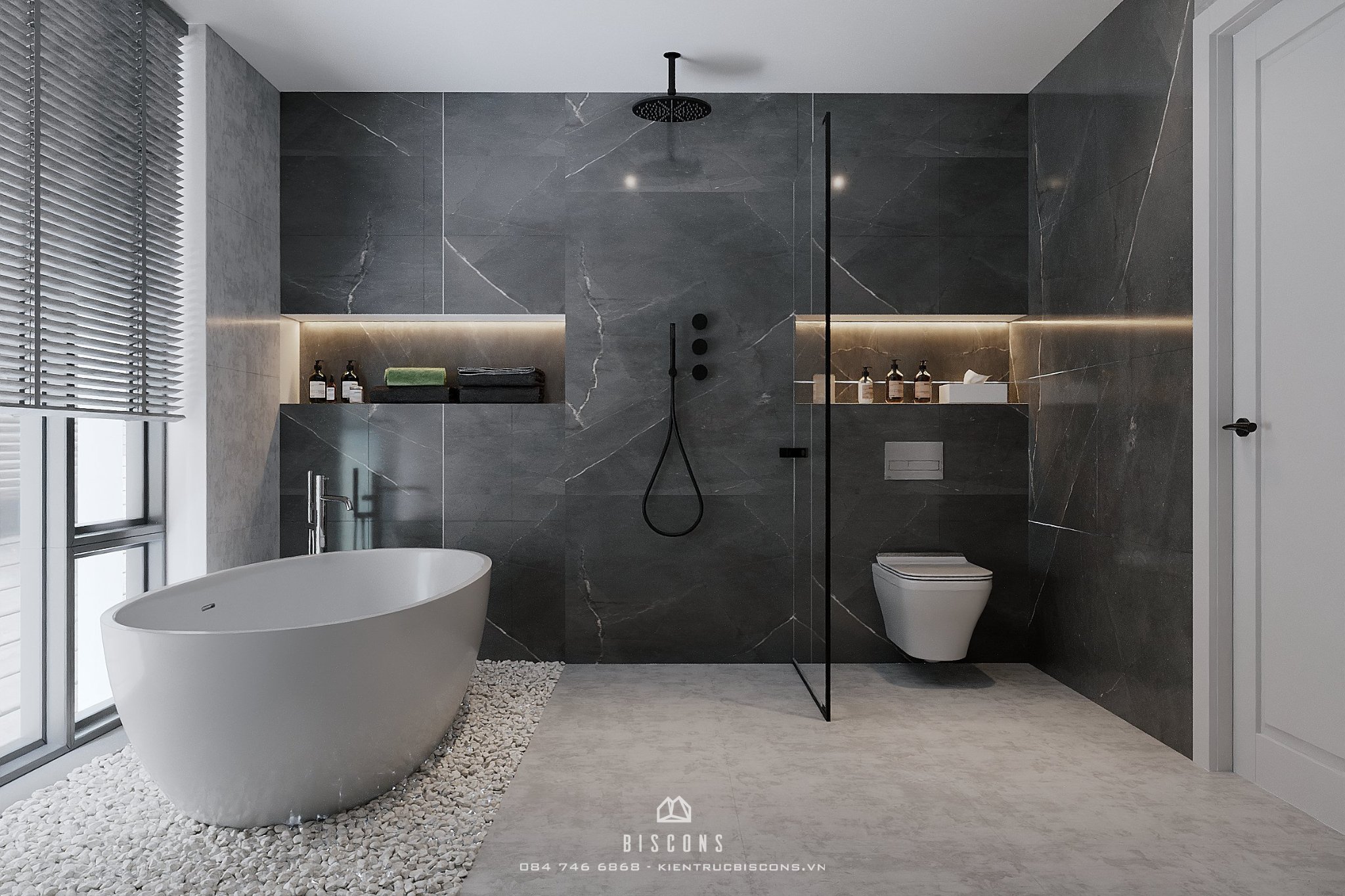 Nhà vệ sinh với không gian tiêu chuẩn nghỉ dưỡng 5*, được nhắc lại ngôn ngữ vật liệu đá tự nhiên, là linh hồn xuyên suốt công trình.