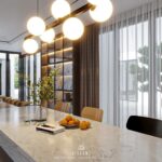 Sự kết hợp giữa ánh sáng tự nhiên và ánh đèn vàng giúp căn bếp thêm phần ấm cúng và dễ chịu. Nguồn sáng từ các hệ đèn thả và đèn hắt âm trần hoàn toàn có thể sử dụng làm nguồn sáng chính vào buổi tối, giúp gia chủ không cần sử dụng đến nguồn sáng trực tiếp như downlight, gây ra chói mắt và làm giảm tính cảm xúc và sự lãn mạn trong không gian phòng ăn.